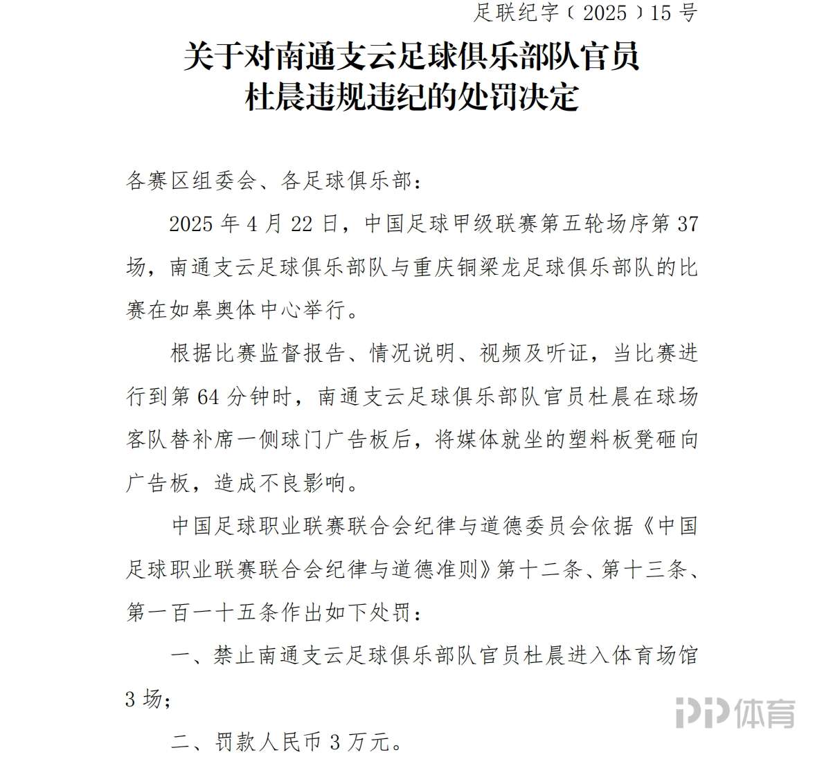 中足联官方发布处罚,南通支云官员杜晨用椅子砸广告牌,禁赛3场,罚款3万。