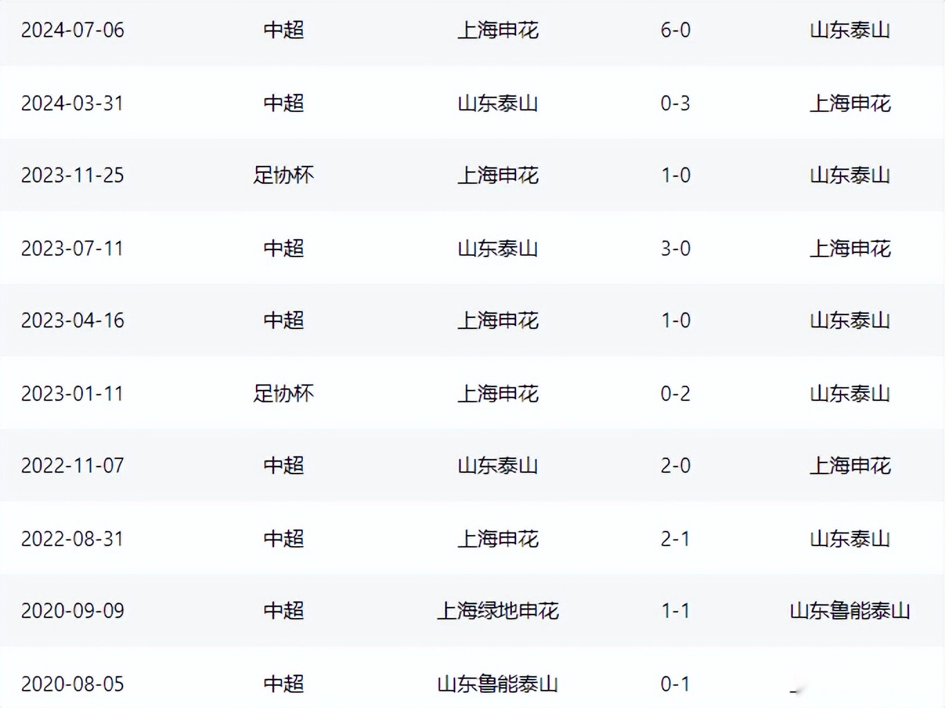 两队过往的交锋记录显示,上海申花占据一定优势。山东泰山队最近10场各项赛事对阵上海申花仅取得3 胜1平6负的战绩。在双方最近三场中超联赛的交手中,山东泰山更是全部落败。不过,足球比赛并非完全由历史战绩来决定,山东泰山队必然渴望在本场比赛中改写这一不利历史,用一场胜利来提升球队的信心并缩小与榜首的积分差距。