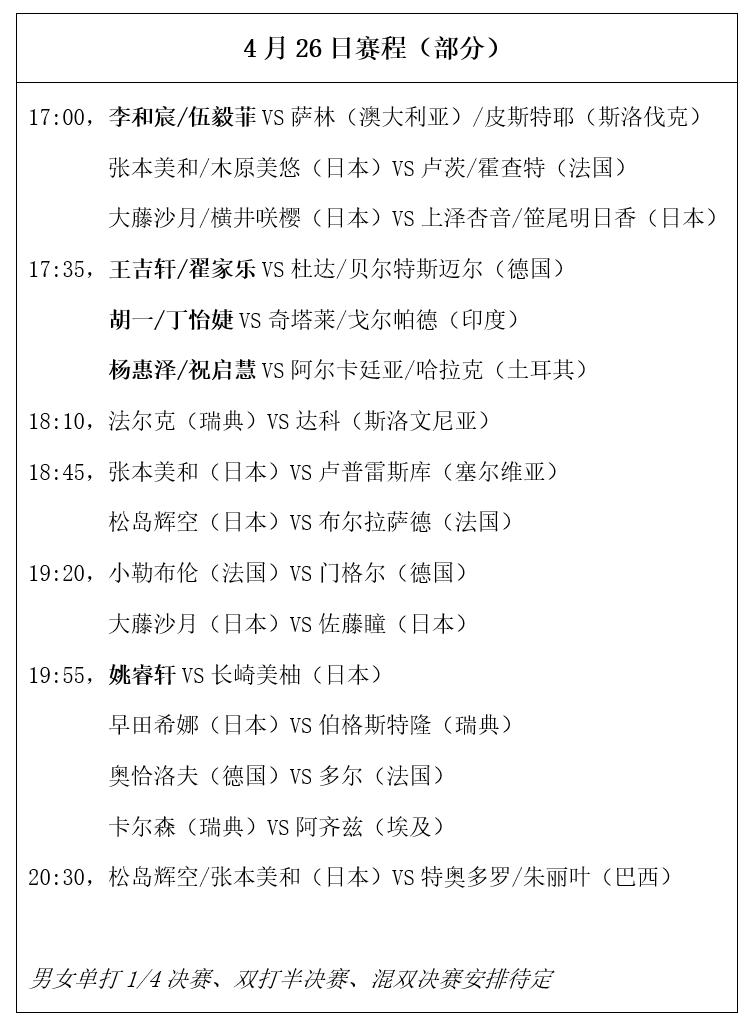 根据安排,国乒将在4月26日开始新的考验,其中下午17:00李和宸/伍毅菲率先登场,与此前3-2淘汰黄旭男/孙龙的跨国配对萨林(澳大利亚)/皮斯特耶(斯洛伐克)争夺男双半决赛门票,鉴于对手已经突破了一次中国队防线,所以这场比赛国乒仍然面临严峻考验。