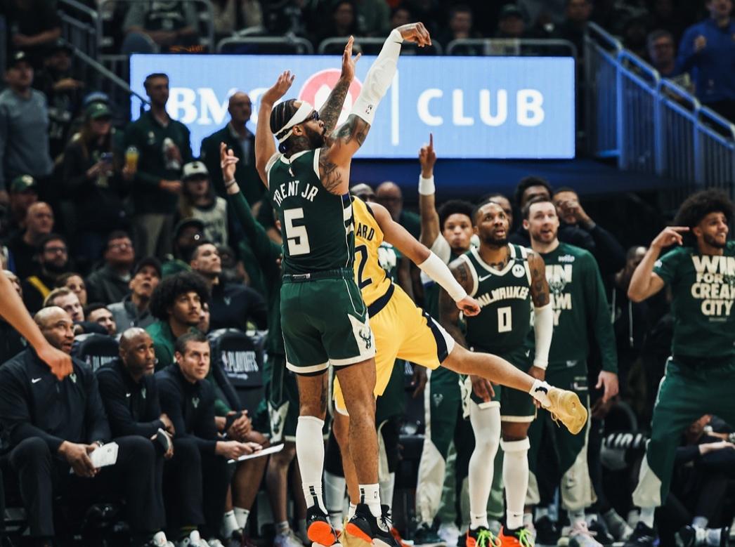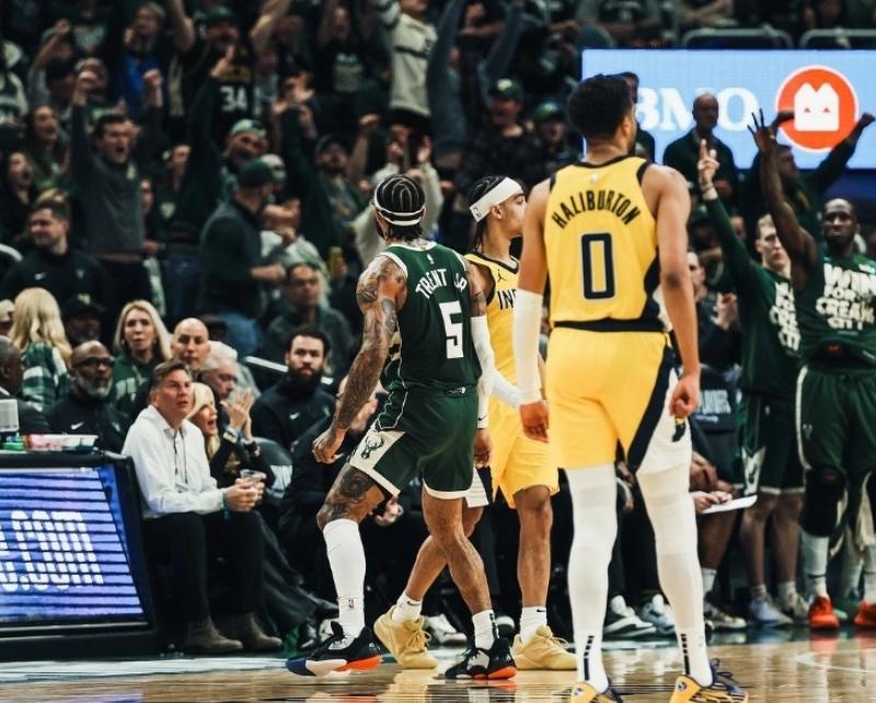 中段特伦特联合字母哥单打,哈里伯顿回应三分球,西卡也和托平也连续在进攻端消耗字母哥,利拉德完全没准星,不过字母哥火力全开,节末AJ格林也命中三分球,利拉德节末终于抛投打进,第一节两队战成26平。进入第二节,西卡内外开花,对飙波蒂斯,此后内史密斯突然开火,库兹马罕见命中三分球。中段内史密斯和特纳再度打停雄鹿,哈里伯顿也续上三分球。内史密斯和谢泼德继续火上浇油,雄鹿进攻端哑火。节末字母哥连续强攻,哈里伯顿突破飞扣拉开12分分差。
