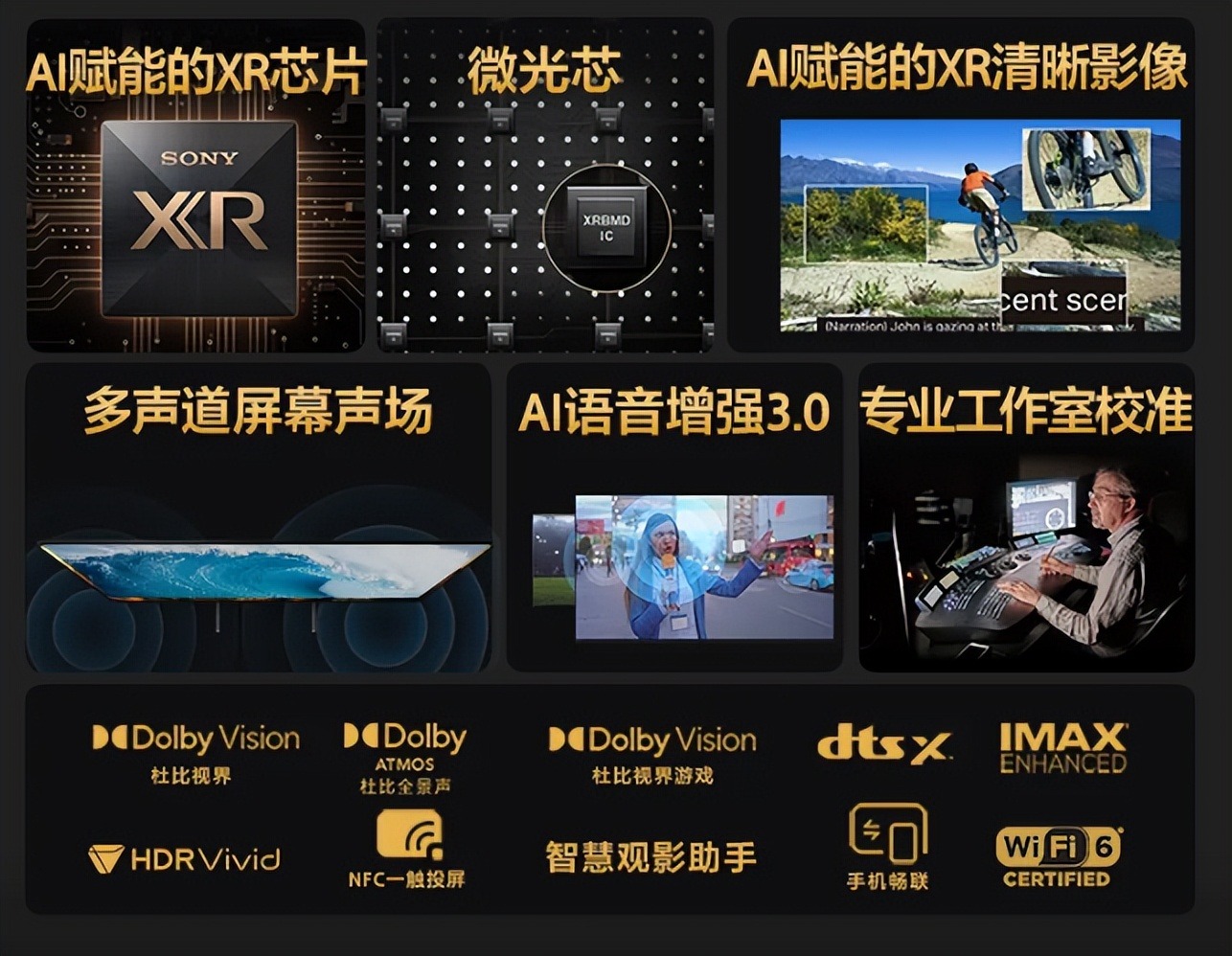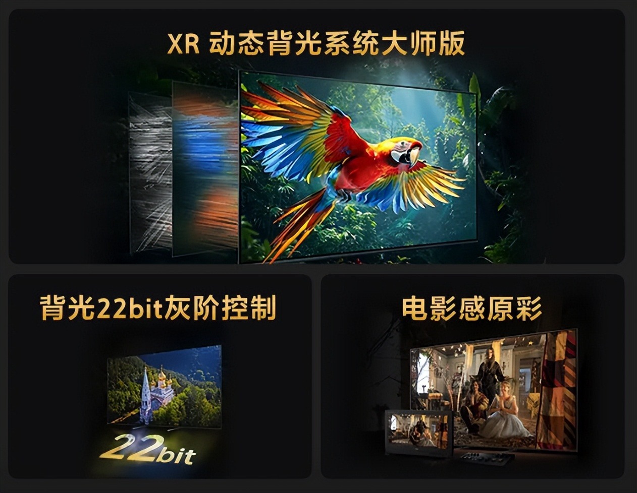 系列的核心技术方面有三项,XR动态背光系统大师,22bit灰阶控制,电影感原彩。比如22bit灰阶,实现400万级别的亮度显示,是16bit灰阶的64倍。为实现这些功能,索尼采用了XR AI芯片,微光芯(背光算法的驱动芯片),特丽魅彩Pro技术,还有专业工作室校准。