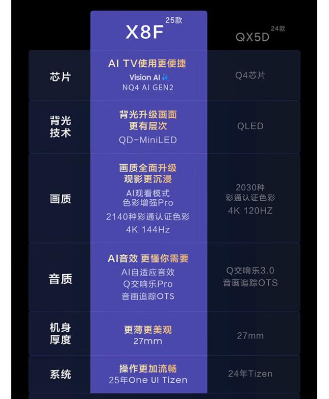 比起去年发布的X9D,今年发布的X8F其实更有看点,这款电视是QD-MiniLED电视,还有AI能力,进一步提升画质。