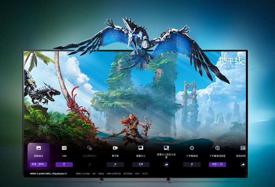 有游戏增强模式,4K 120Hz,完美适配PS5。有6GB运存,32GB存储,可以实现秒开机,还有NFC一碰投屏,WiFi 6,蓝牙5.3,AI远场语音等。功率318W。