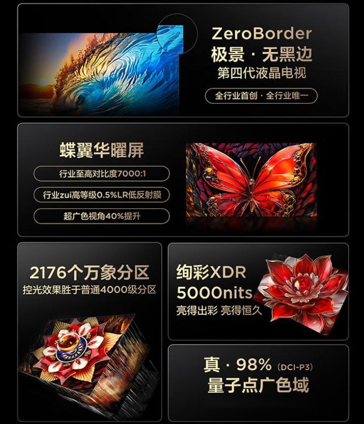 其峰值亮度5000nit,色域98% DCI-P3,有2176个万象分区,屏幕低反射率,静态对比度达到了7000:1。采用了精密封屏工艺,实现3-4mm极窄边框,0黑区,0缝隙。