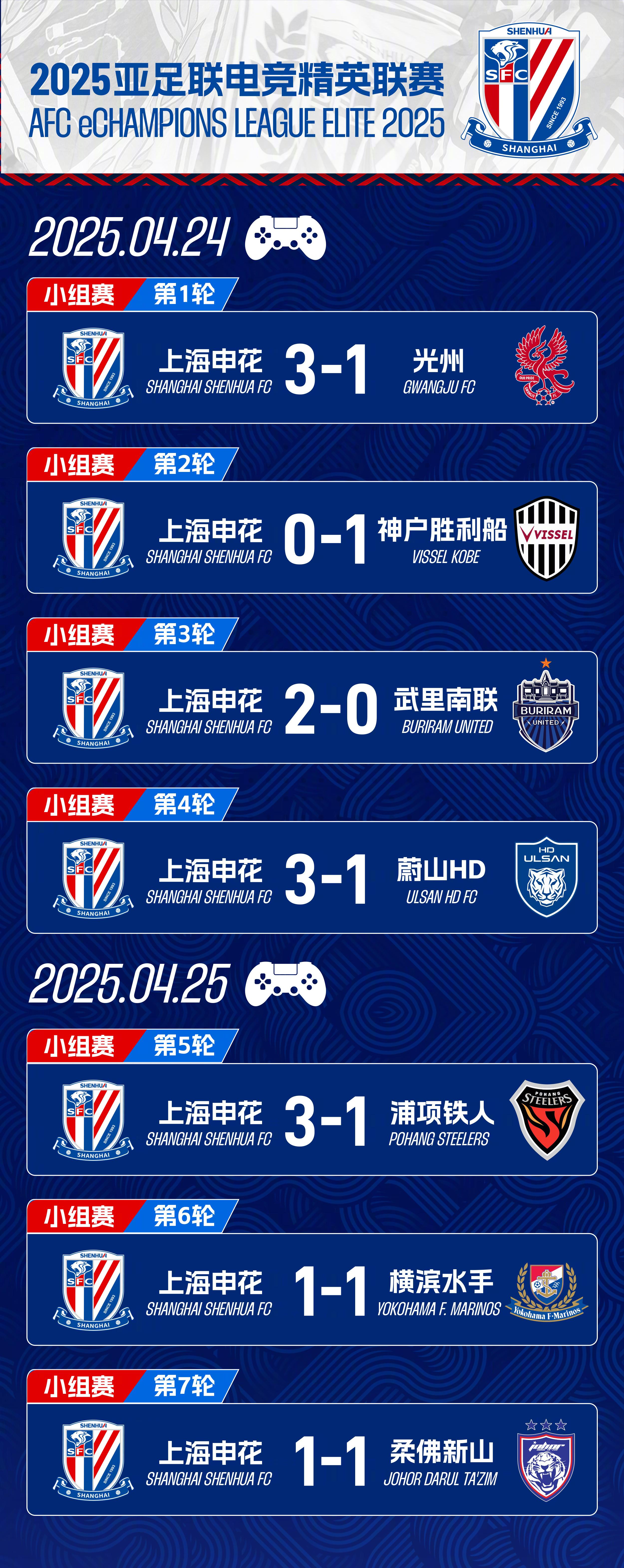 北京时间4月26日,据上海申花官方消息,在2025亚足联电竞精英联赛中,上海申花4胜2平1负积14分排名小组第二,交叉淘汰赛将对阵浦项铁人。