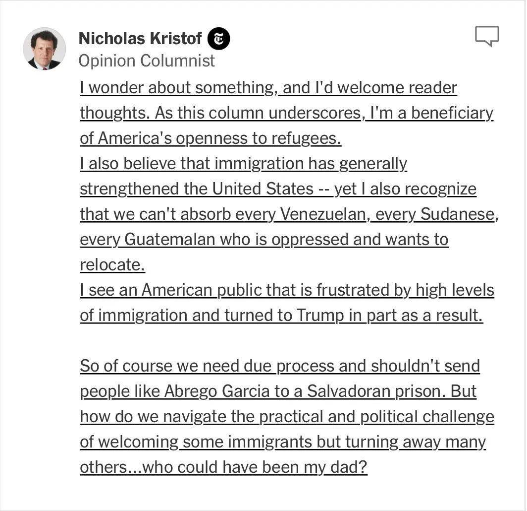所以,我们当然需要正当程序,不应该将像阿布雷戈·加西亚这样的人送往萨尔瓦多监狱。但我们如何应对这一实际和政治挑战:在欢迎部分移民的同时,不得不拒绝众多其他人——那些本可能与我父亲命运相同的人?