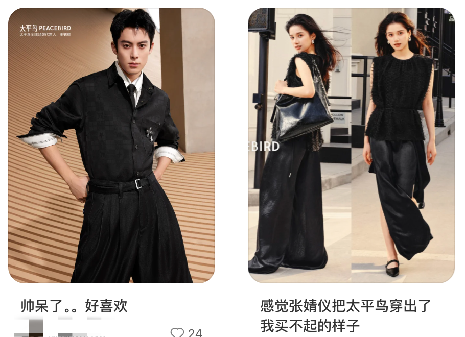 后来,随着青年偶像的更迭,太平鸟的代言人一路从欧阳娜娜换到张婧仪和王鹤棣,始终紧跟娱乐圈的流行风向。