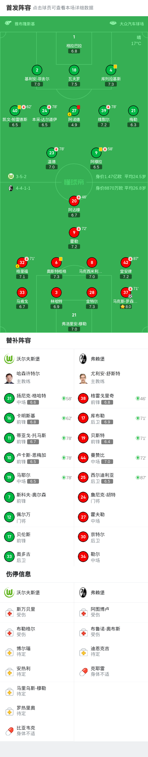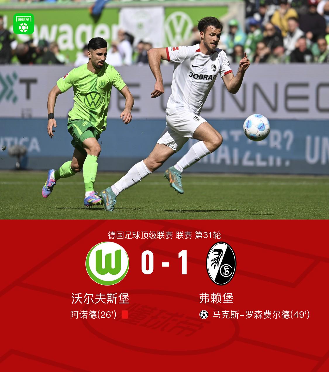北京时间4月26日德国足球顶级联赛 联赛 第31轮,沃尔夫斯堡主场对阵弗赖堡。弗赖堡马克斯-罗森费尔德破门。最终比分沃尔夫斯堡 0 - 1 弗赖堡。