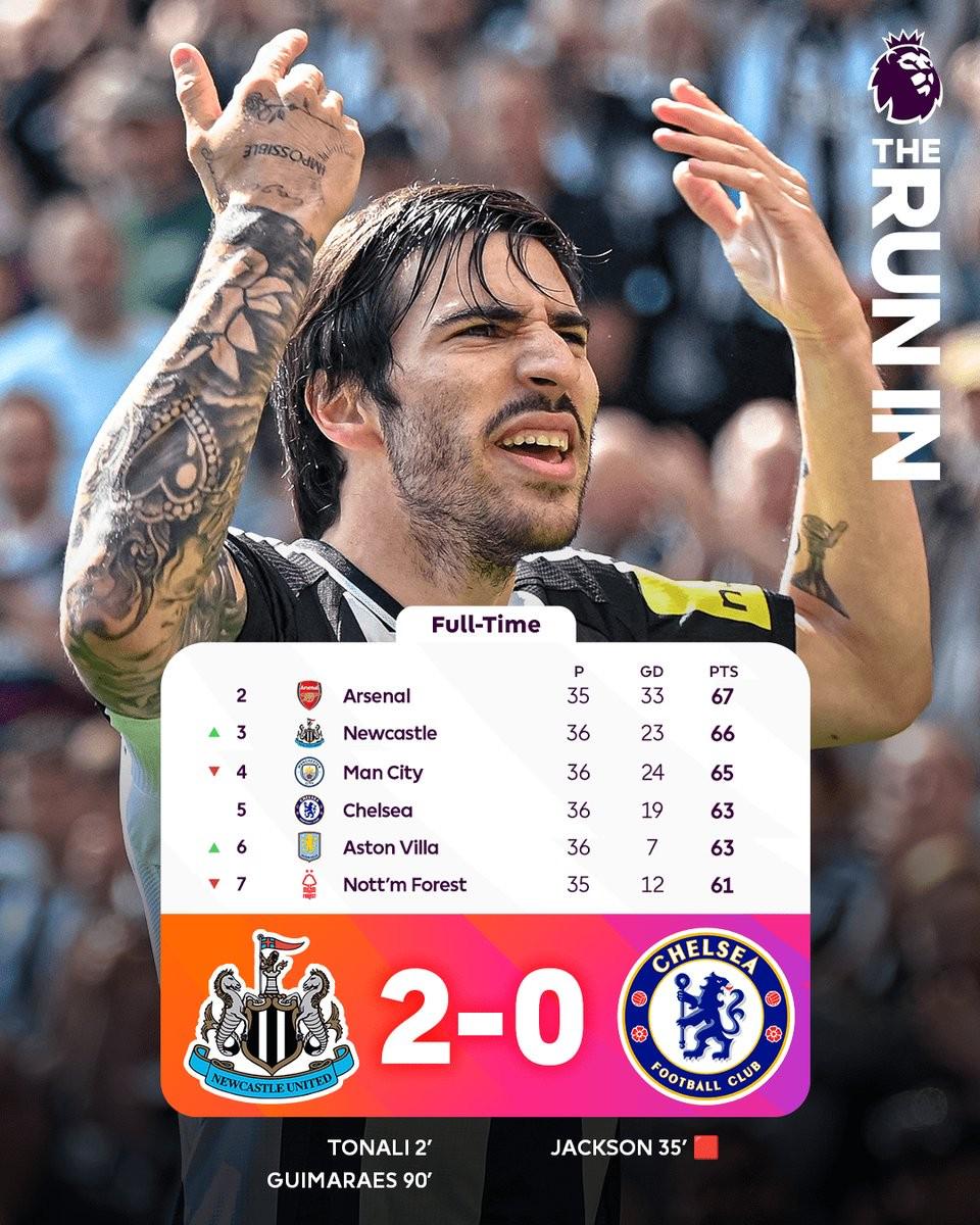 在2-0击败切尔西后,纽卡斯尔联本赛季英超36场比赛战绩为20胜6平10负。