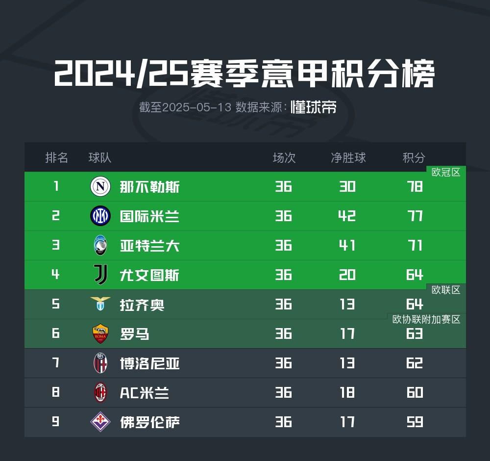 在2024/25赛季意甲联赛结束了第36轮的全部比赛之后,争四形势变得更加混乱。