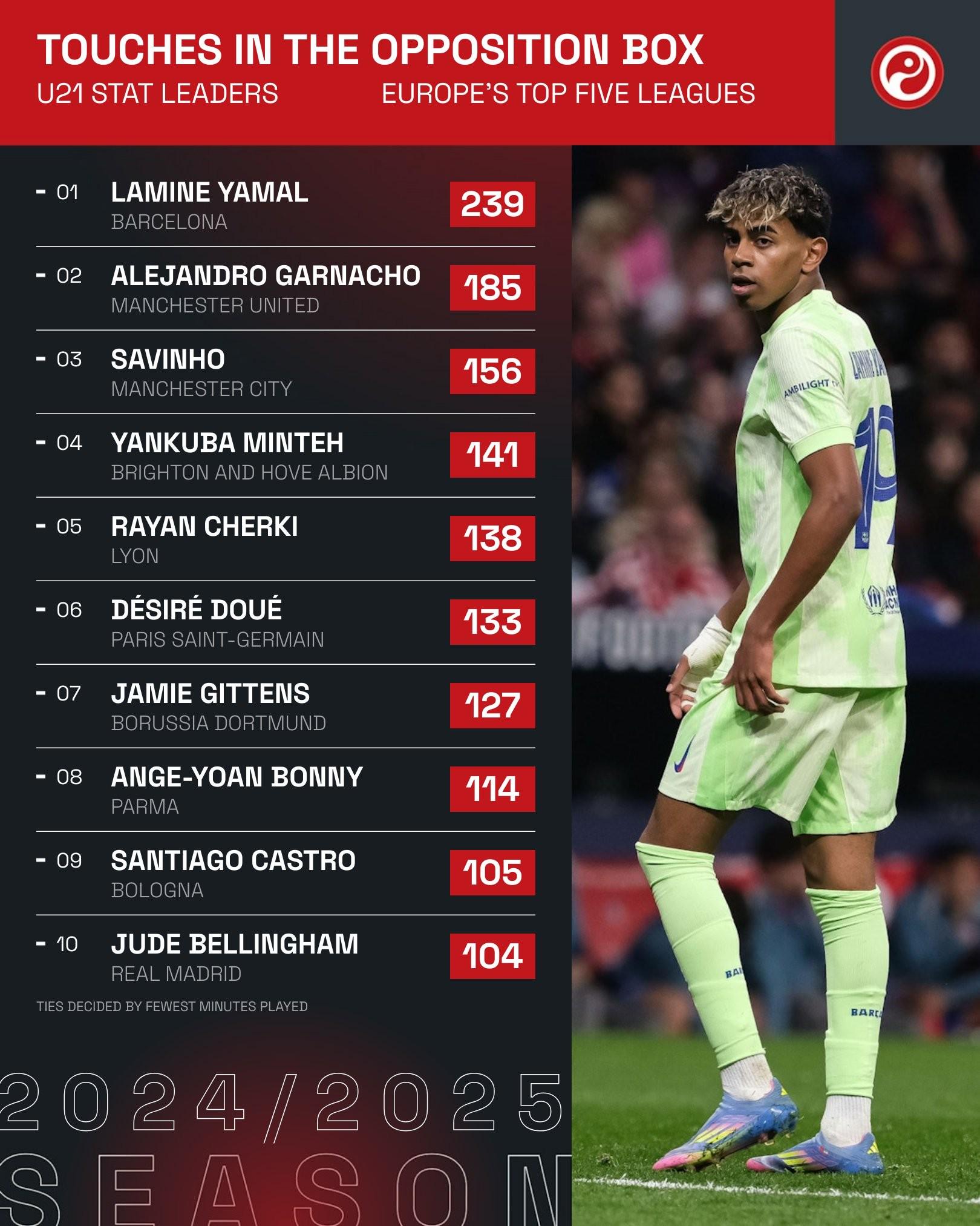 据统计,亚马尔是本赛季欧洲五大联赛在对方禁区内触球次数最多的U21球员。