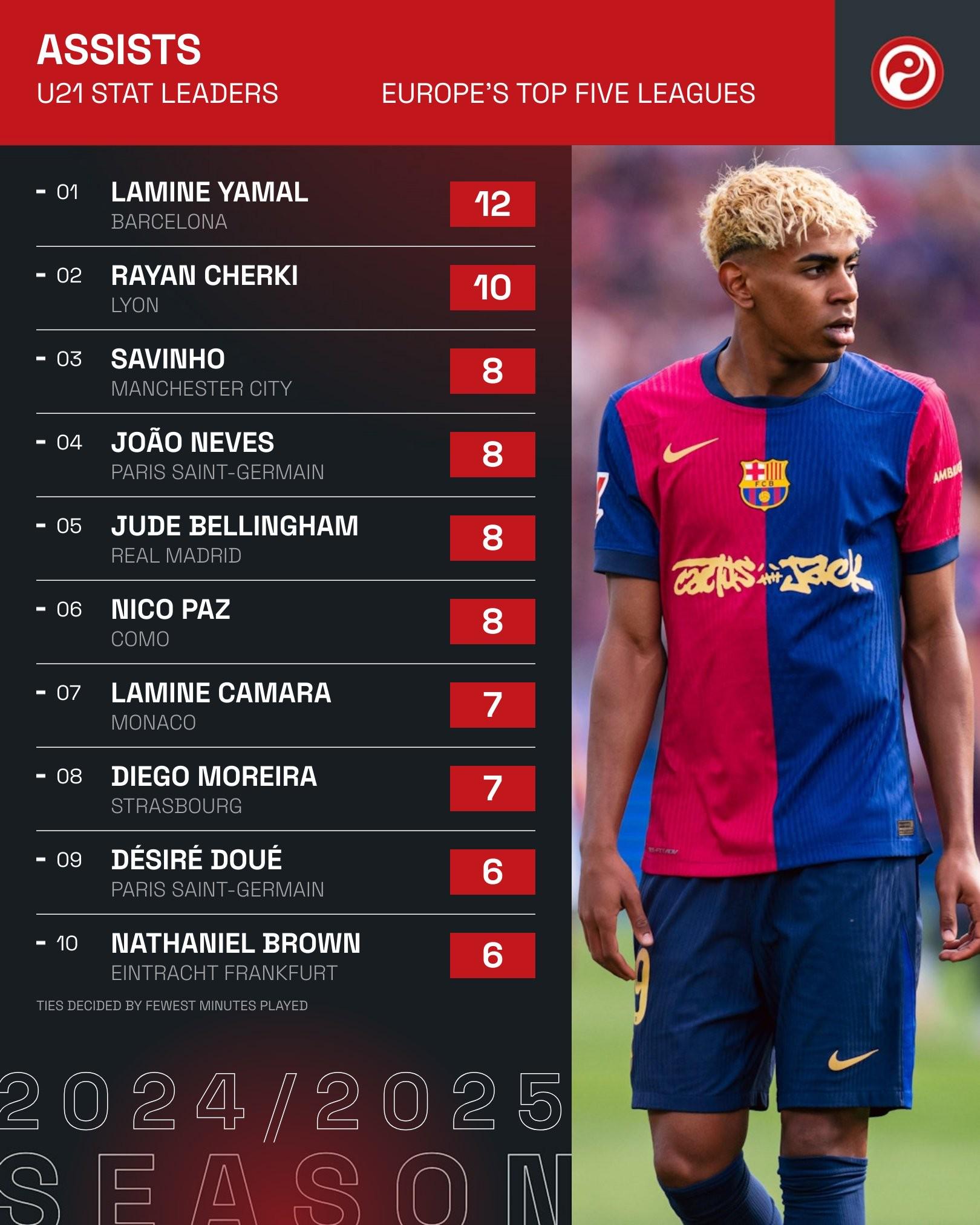 2024/25赛季五大联赛U21球员助攻榜(截至5月12日,次数相同时出场时间较少者排名靠前)