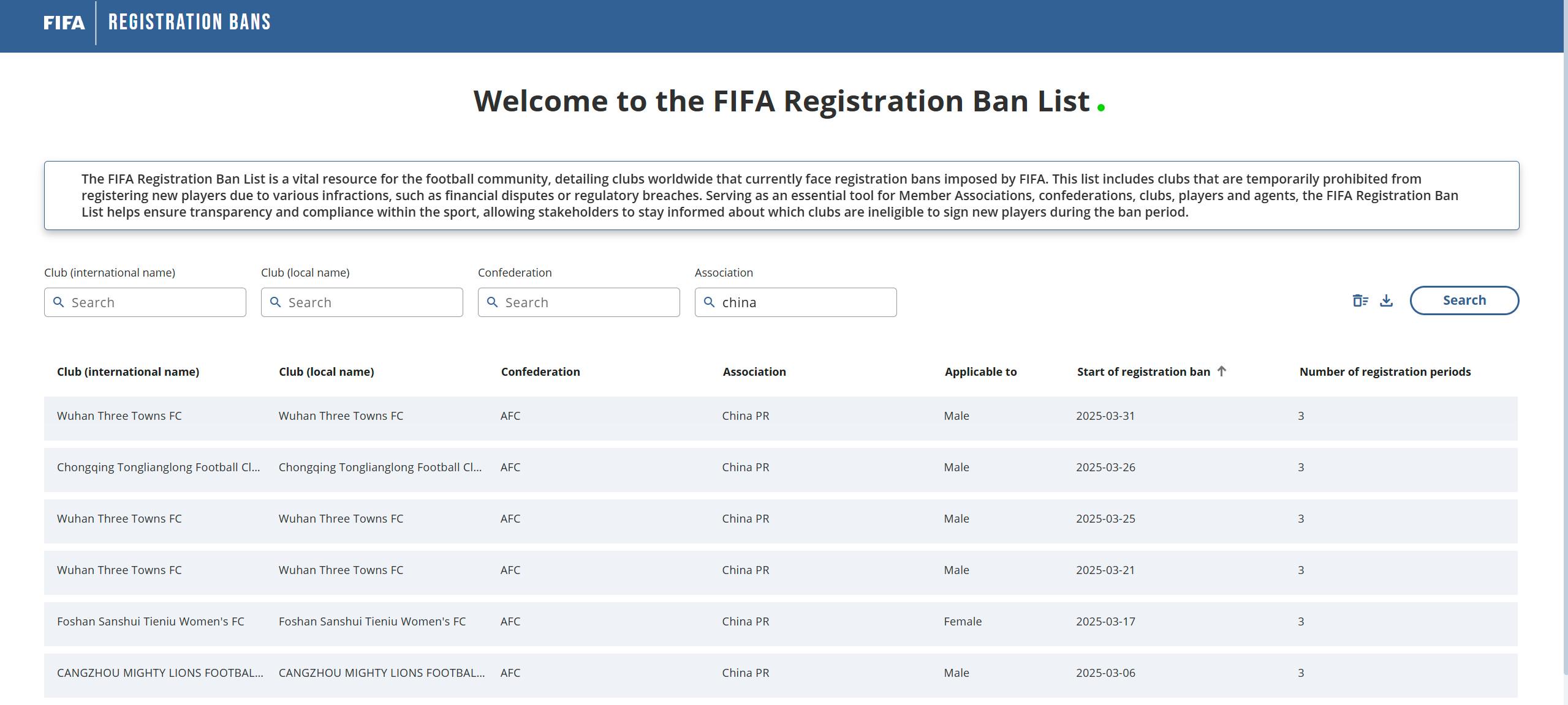 北京时间5月13日,FIFA官网的转会注册禁令平台显示,石家庄功夫转会禁令解除,三镇与铜梁龙的禁令仍在持续。