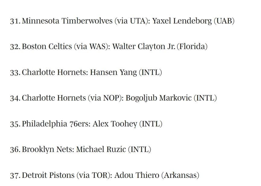 北京时间5月26日,美媒《体育画报》更新最新一期模拟选秀榜单,其中中国球员杨瀚森被预测在第33顺位被黄蜂队选中。