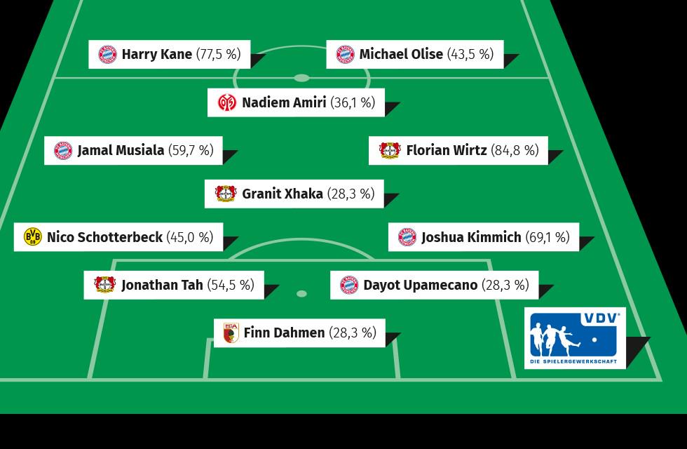 后卫:施洛特贝克(多特蒙德,45.0%)、约纳坦-塔(勒沃库森,54.5%)于帕梅卡诺(拜仁慕尼黑,28.3%)、基米希(拜仁慕尼黑,69.1%)