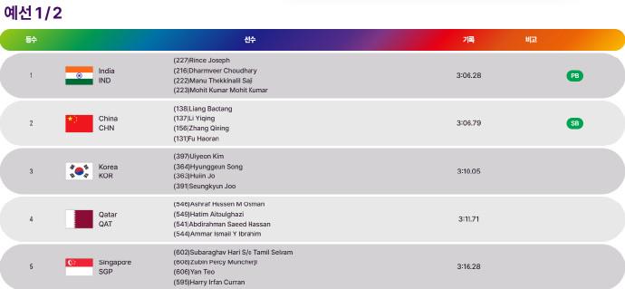 冲刺棒印度选手占据上风,付浩然没有发力猛追最终以第二名轻松过线。印度队以3分06秒28获得第一,与中国队共同进入晚上的决赛争夺。另一小组斯里兰卡队以3分07秒66排名小组第一晋级。