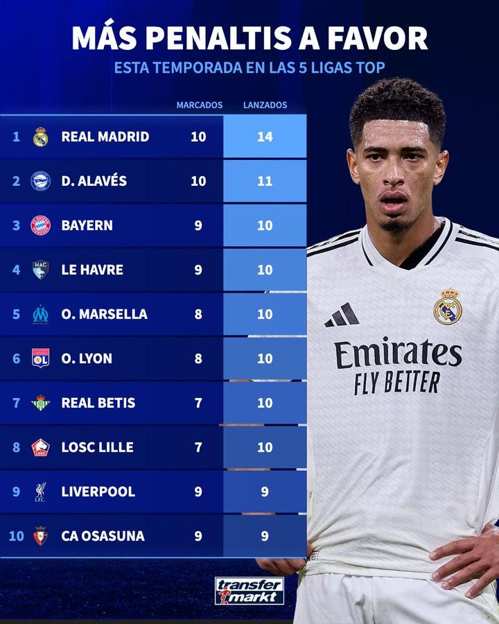 北京时间5月29日,德国转会市场列出了本赛季五大联赛获得点球次数最多的球队排行榜。其中,皇马排名第一,拜仁与利物浦则分列第三、第九。