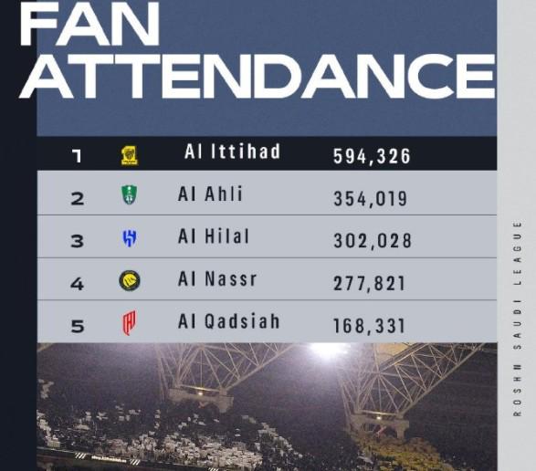 北京时间5月30日,沙特联赛官方公布本赛季主场上座人数前5俱乐部,其中吉达联合主场累计上座人数594326人为最多,新月302028人次排名第3,利雅得胜利本赛季主场累计上座人数277821人为第4。