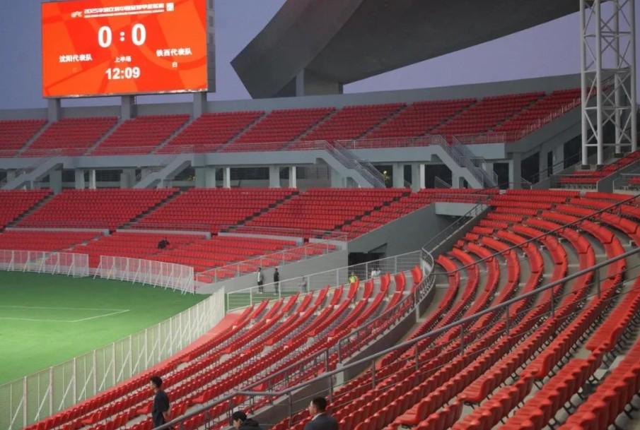 红色座椅的看台与绿色草皮的色调搭配相比原来的蓝色座椅、绿色草皮搭配看上去更加舒适,东区看台用黄色座椅拼出的“沈阳铁西”大字格外醒目。