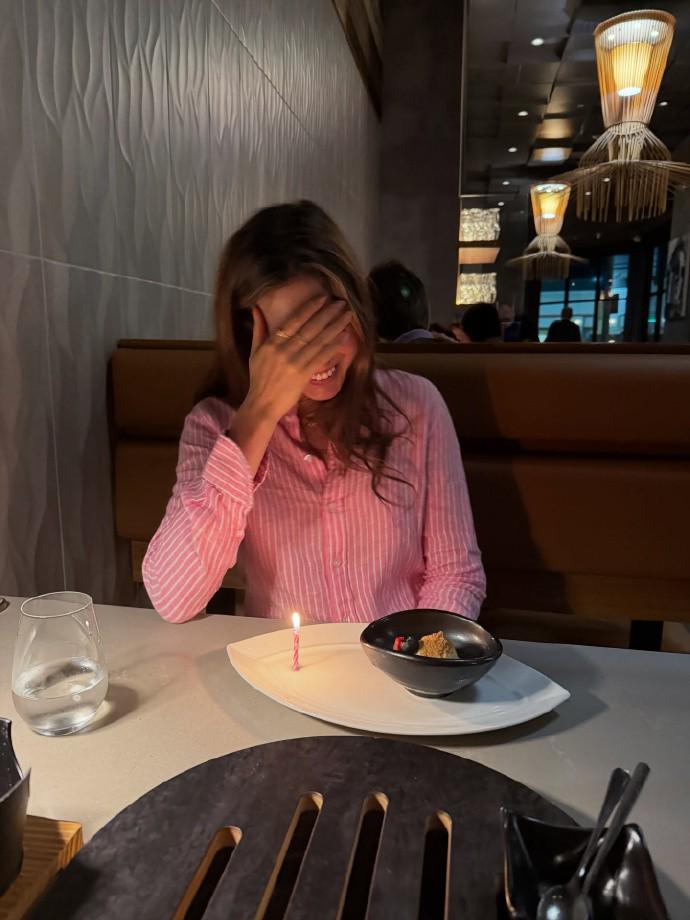 5月31日,谷爱凌社媒分享照片,冲浪、攀岩、会好友;与阿汤哥畅聊,与詹姆斯合照。其中一张烛光晚餐图,谷爱凌还害羞的捂住了眼。