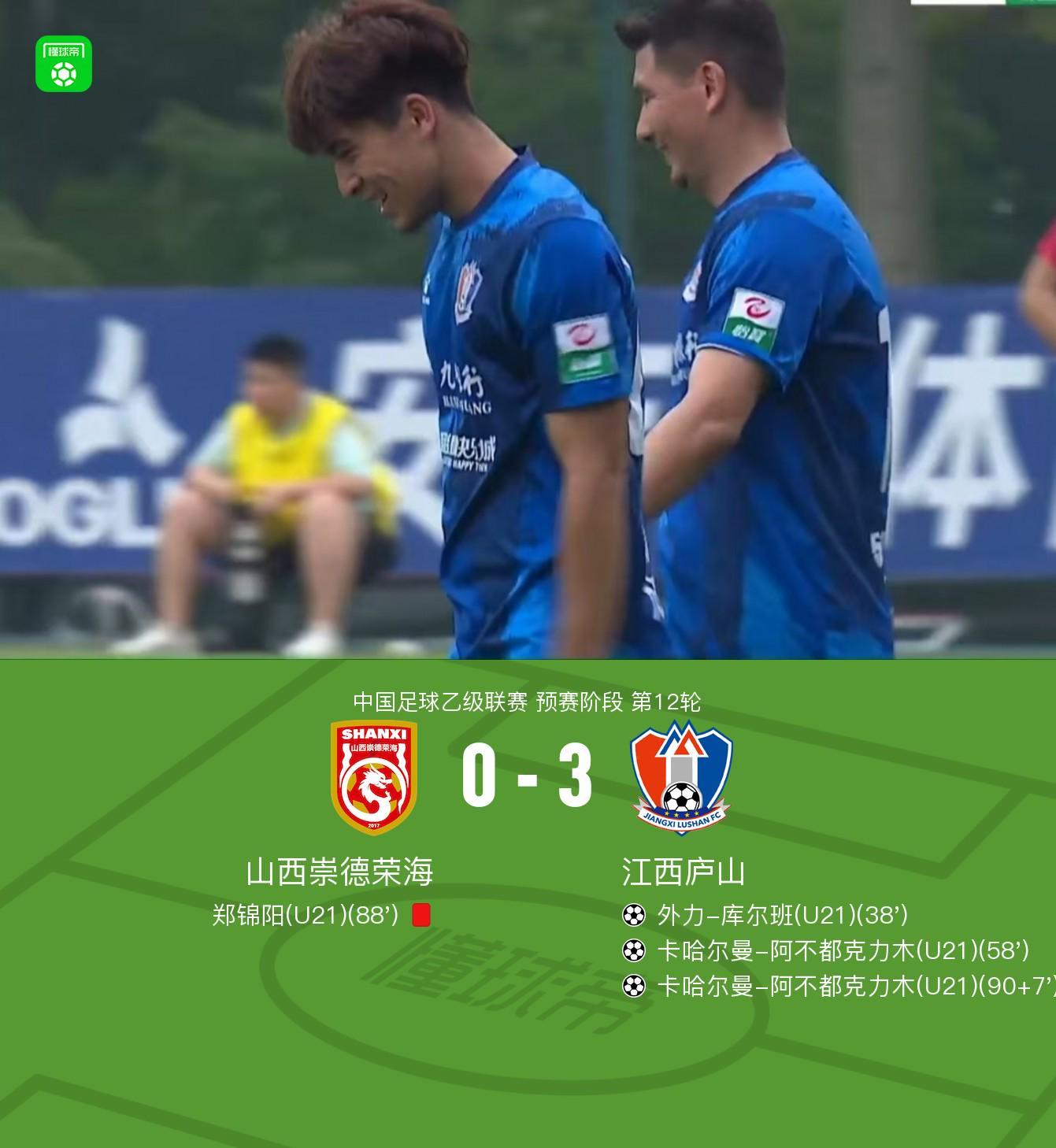 北京时间5月31日中国足球乙级联赛 预赛阶段 第12轮,山西崇德荣海主场对阵江西庐山。上半场江西庐山外力-库尔班破门,下半场卡尔哈曼将比分优势扩大,郑锦阳染红,补时阶段,卡尔哈曼再入一球,全场战罢,江西庐山3-0战胜山西崇德荣海。