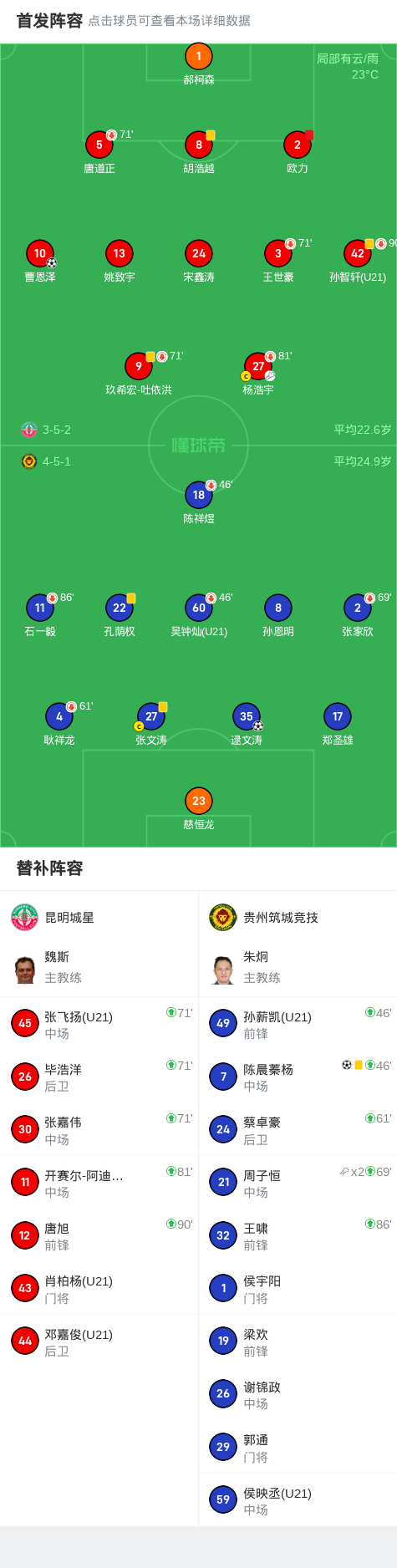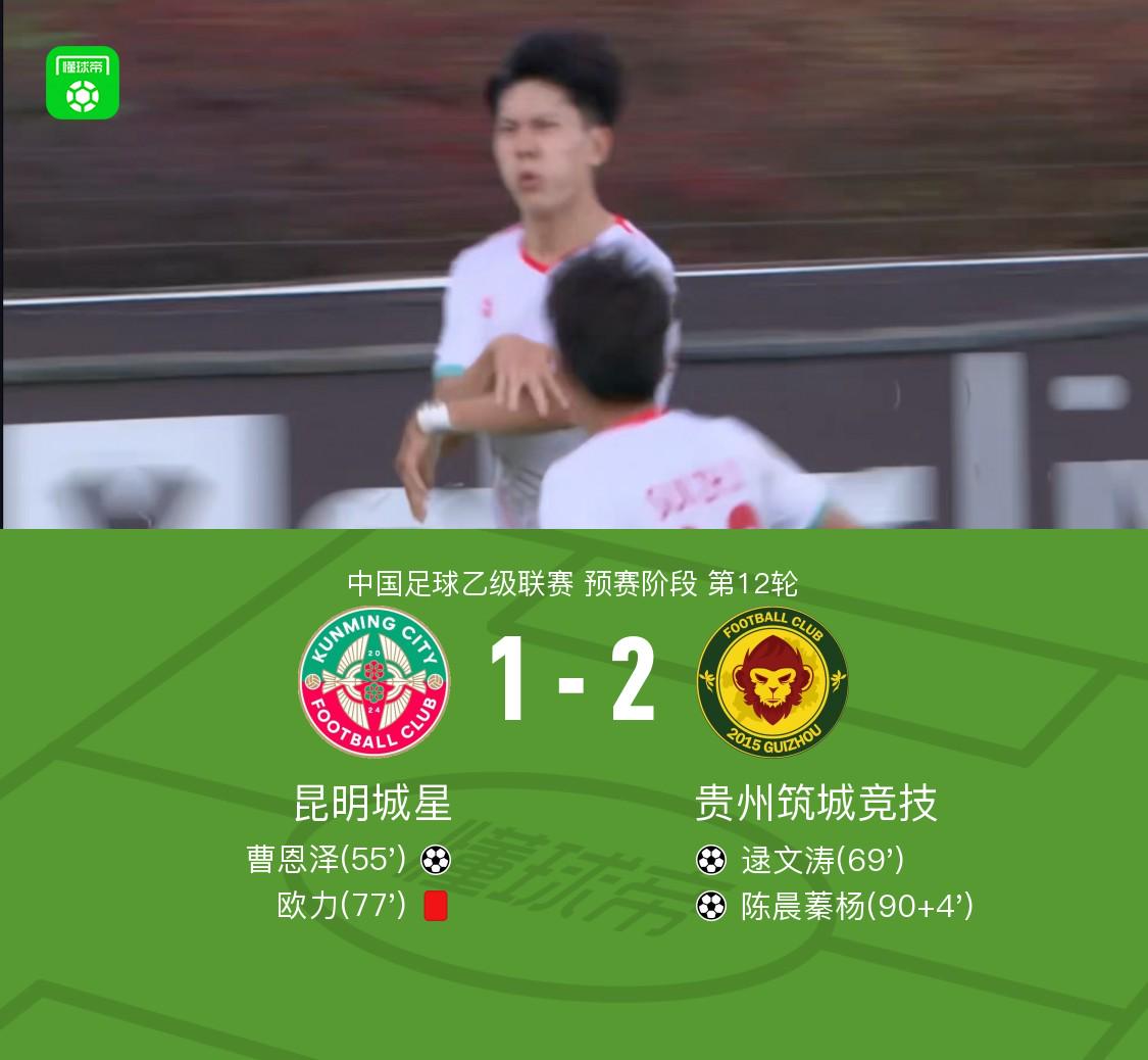 北京时间5月31日,中国足球乙级联赛预赛阶段第12轮,昆明城星主场迎战贵州筑城竞技。比赛中,昆明城星由曹恩泽率先取得进球。贵州筑城竞技则由逯文涛扳平比分,并在补时阶段由陈晨蓁杨完成绝杀。此外,昆明城星有一名队员在比赛中被红牌罚下。最终,昆明城星1-2不敌贵州筑城竞技。