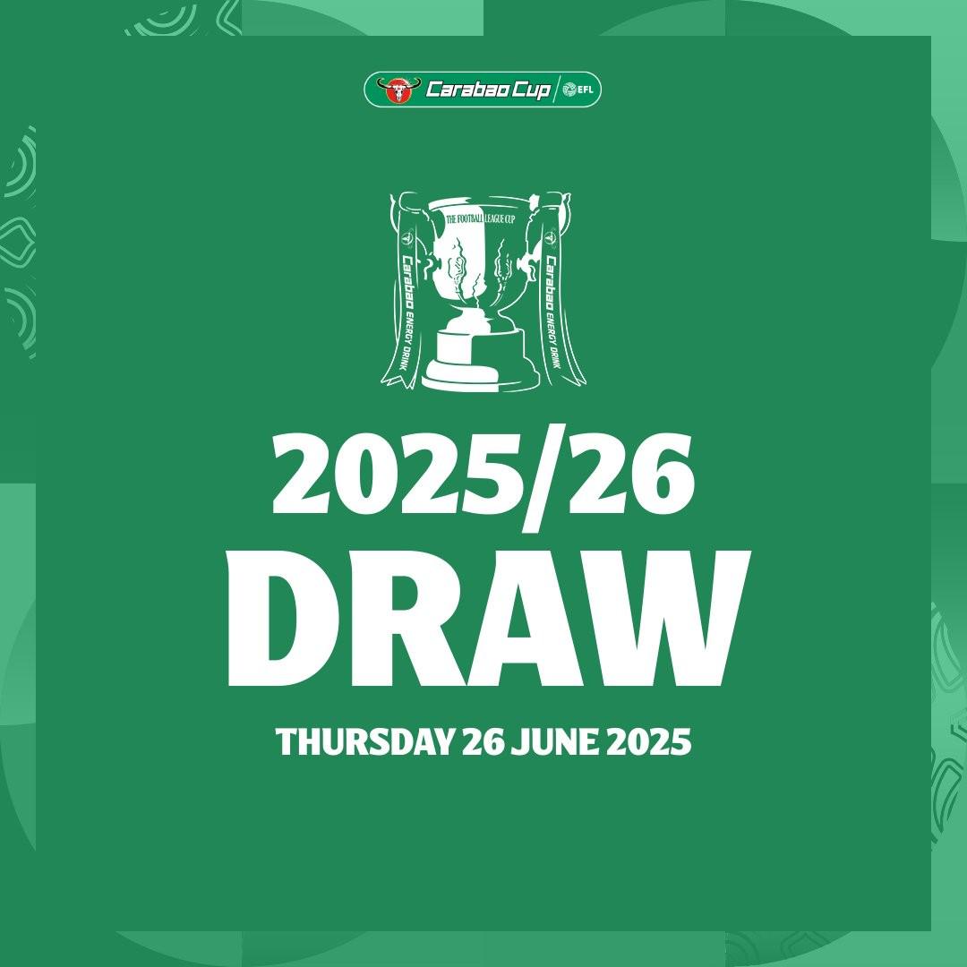英格兰足球联盟(EFL)官方消息,2025-26赛季英格兰联赛杯抽签将于当地时间6月26日举行。