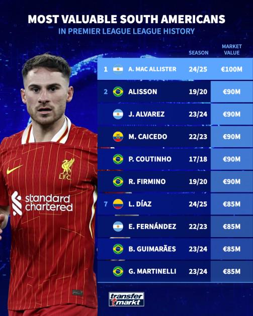 北京时间5月30日,英超联赛的德转身价迎来更新,今天德转官方账号公布了英超历史上南美球员最高身价top10。