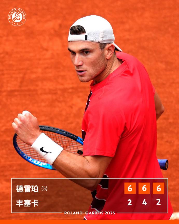 5月31日,法网2025男单第三轮,德雷珀仅耗时1小时46分以3-0(6-2、6-4、6-2)击败巴西新星丰塞卡,成功锁定一个16强席位。