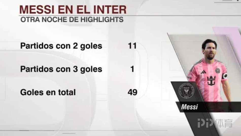 梅西在加盟迈阿密国际之后,有11场比赛单场打入2球,有1次上演了帽子戏法,总计打进49球。
