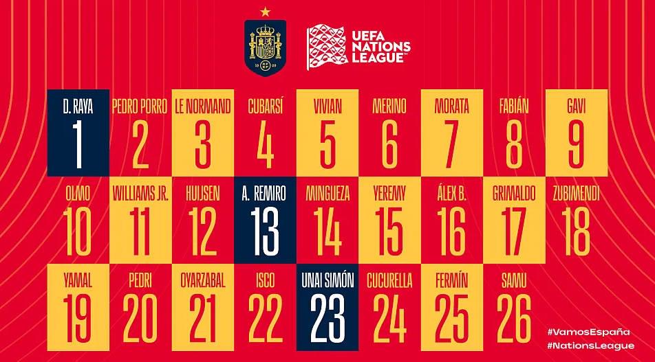 中场:6-梅里诺、8-法比安-路易斯、9-加维、10-奥尔莫、16-巴埃纳、18-苏比门迪、20-佩德里、22-伊斯科、25-费尔明