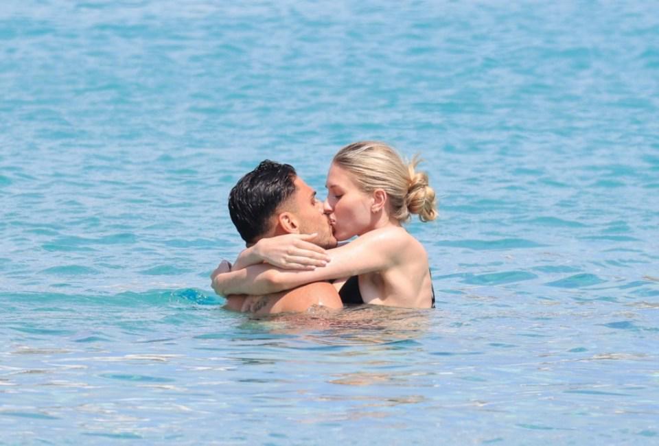 在流出的度假画面中,马夫罗帕诺斯与他的学生女友莉娜-施文格尽显恩爱。两人不仅在金色沙滩上追逐嬉戏,更在清澈的爱琴海碧波中相拥热吻,笑容灿烂。莉娜身着黑色比基尼,显得格外亮眼。这对情侣此前就常在社交媒体上互动传情,莉娜更以亲昵的“亲爱的”称呼男友,恋情早已公开。