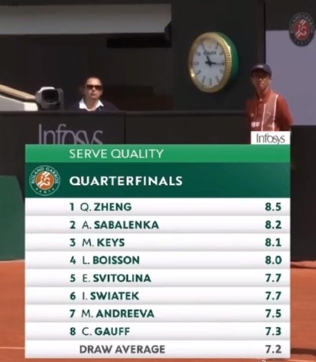 比赛中,官方给出了女单八强发球质量排名,郑钦文排在第一,萨巴伦卡紧跟其后。