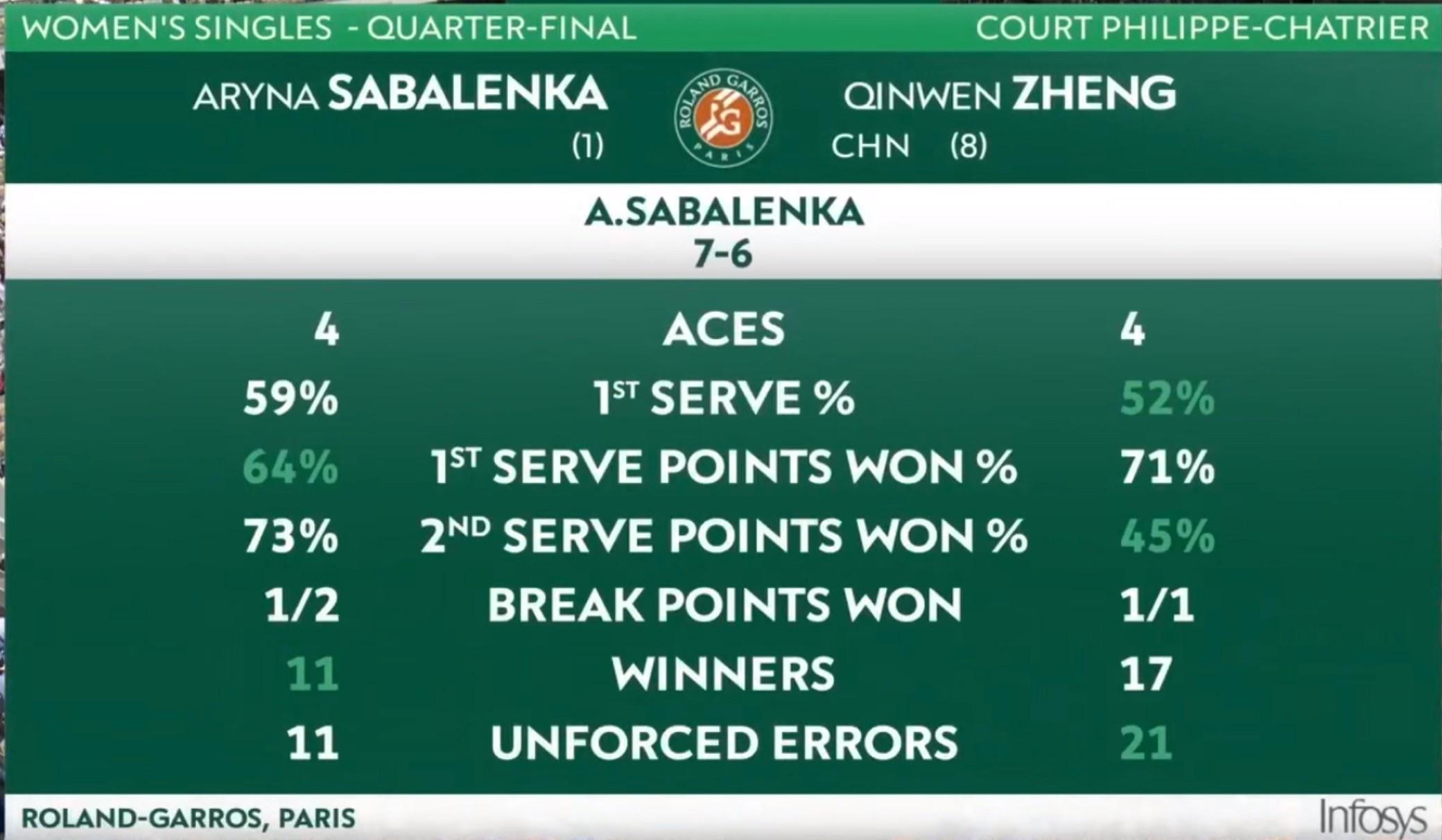 第一盘由萨巴伦卡先发,前两局双方都保发成功。第三局郑钦文加大接发进攻力度,逼出两个破发点并成功兑现。第八局郑钦文在30-15时连续出现两个双误,萨巴伦卡抓住机会完成回破,局分来到4-4。第12局郑钦文非保不可的发球局,30-30时郑钦文认为萨巴伦卡出界,主动叫停比赛,但主裁认为该球落点处在界内,萨巴伦卡获得一个盘点,但随后郑钦文打出精彩穿越,连拿三分,保住了自己的发球局。双方进入抢七。